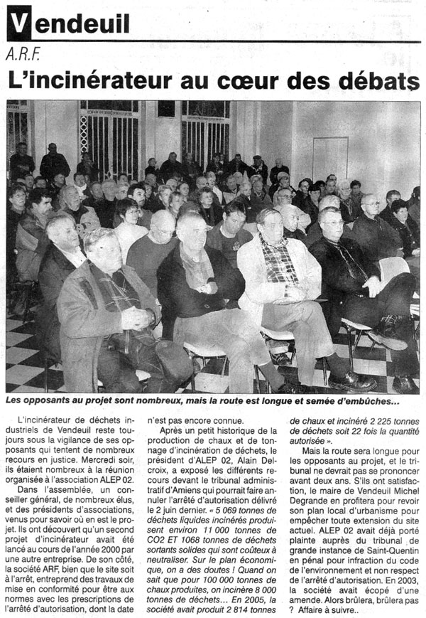 Mais la route sera longue pour les opposants au projet, et le tribunal ne devrait pas se prononcer avant deux ans. S'ils ont satisfaction, le maire de Vendeuil Michel Degrande en profitera pour revoir son plan local d'urbanisme pour empêcher toute extension du site actuel. ALEP 02 avait déjà porté plainte auprès du tribunal de grande instance de Saint-quentin en pénal pour infraction du code de l'environnement et non respect de l'arrêté d'autorisation. En 2003, la société avait écopé d'une amende. Alors brûlera, brûlera par ? Affaire à suivre...