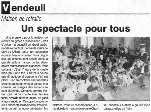 Une première pour la maison de retraite qui grâce à l'association "Trait d'union" a accueilli vendredi après-midi les enfants du centre de loisirs de Moy-de-l'Aisne pour un spectacle musical haut en couleur. Tous déguisés, les enfants sont arrivés dans la grande salle à manger où les attendaient toutes les têtes blanches. Pour certains, c'était l'heure de la sieste mais pour une fois, elle fut plus courte que d'habitude et personne s'en est plaint. Bien au contraire car quand les enfants ont commencé à danser et à chanter, les visages des anciens se sont illuminés. Certains comme Robert ont même chanté avec les enfants, ravis de donner un peu de gaité à leurs ancêtres. Ce superbe spectacle a enchanté les résidents, très contents de voir la jeune génération les distraire. Pour les récompenser, la directrice de la maison de retraite Chantal Trichet leur a offert le goûter, avec gâteaux et jus de fruits.