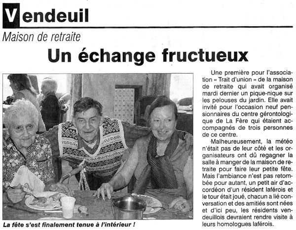 Un échange fructueuxUne première pour l'association "Trait d'union" de la maison de retraite qui avait organisé mardi dernier un pique-nique sur les pelouses du jardin. Elle avait invité pour l'occasion neuf pensionnaires du centre gérontologique de La Fère qui étaient accompagnés de trois personnes de ce centre.