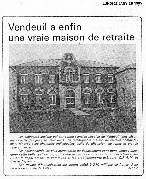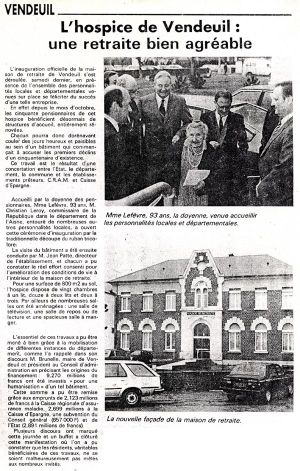 Les cinquante anciens qui ont connu l'ancien hospice de Vendeuil vont désormais couler des jours heureux dans une remarquable maison de retraite complètement rénovée avec chambres individuelles, salle de télévision, de repos et grande salle à manger.